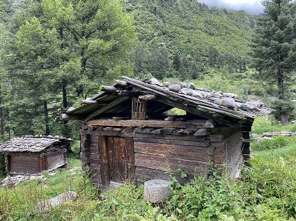 隨著海拔高度的升高與緯度的增加,一路上的植被類型也在不斷發(fā)生著變化。穿越深闊的暗針葉林,六匹馬起起落落的腳力踩出了一個(gè)馬幫的回音,所有的植物在各自的生命活動(dòng)中散發(fā)出了清新怡人的芬多精,吉美為此小聲哼唱起了愉悅的歌兒,細(xì)聽卻又像是兩只云雀在不遠(yuǎn)處鳴囀。再往上走,周遭的林木又轉(zhuǎn)換成了密致的高山杜鵑林,無數(shù)修長(zhǎng)的木流蘇垂掛在樹枝上,像哈達(dá)。一路沉默的南杰轉(zhuǎn)頭來開始與我說話“六月間,這里的每一棵樹都開滿了粉白的花朵,一樹樹的煞是壯觀好看,我一個(gè)人經(jīng)過,總能聽到一朵、兩朵花鈍落的聲音。最初,我以為是馬雞飛落了,輕聲走入林中打探,身后又會(huì)落下一朵、兩朵花,那聲音厚重沉實(shí),林中又過于安靜,我就慌忙走出了林子......”南杰說話聲音秀氣,我聽得時(shí)斷時(shí)續(xù),過風(fēng)吹送著南杰話語中杜鵑花的香氣。前路逐漸敞亮起來的時(shí)候,路邊的杜鵑樹開始變得稀稀落落了,只見路旁堆壘著高高低低的新鮮柴垛。再往上就沒有樹木了,只有矮腳盤香和淺草,路邊的山包上緊貼著密密麻麻的貌似多肉植物的草葉,從草心抽出來一枝枝薔薇紅的花柱在風(fēng)中頻頻點(diǎn)頭。雍貝在前方的馬匹上頭低得越來越沉,以為他瞌睡,我喊了聲貝,他回頭看我,面色灰白嘴唇有些發(fā)紫。南杰回望我們后一躍下馬,從路邊的淺草中折斷幾根盤香枝別在雍貝的耳際,說是可以抵御高反。剩余的兩根遞給我,細(xì)小的枝葉上積著一層薄薄地灰色粉塵,深嗅有松脂的清香氣味,安人心神。