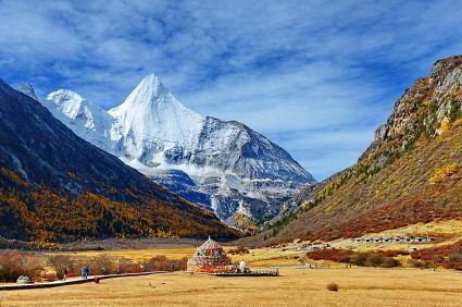 尤其亞丁匯集了稻城秋天所有濃烈的顏色:純凈的藍(lán)天,飛過白云間的蒼鷹,風(fēng)格獨(dú)特的藏鄉(xiāng)建筑,金黃的秋楊,深紅的沼澤,波光粼粼的小河,多么美的一幅油畫,是人們歸隱田園的夢想天堂。