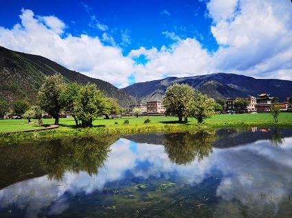 夏日,暖陽溫柔,沿途入眼皆是綠意。聽說,俄色花盛放的時(shí)候,潔白的花成簇成團(tuán),一樹樹漫山遍野,像九天的云朵堆滿山谷田野,汽車從公路疾馳,風(fēng)里都是俄色的清香。我們來的時(shí)候稍微遲了,錯(cuò)過了俄色的花期,花開荼蘼,殘花在蒼翠的枝葉里躲藏,風(fēng)里是飛舞的花瓣,紛紛揚(yáng)揚(yáng),在棕紅的棧道鋪成白色的云錦,樹下是芬芳的余味。棧道邊,金黃的雪白的野花鋪灑在翠綠的草甸上,像濃烈的水彩。地里的青稞,綠得晃人眼睛,綿延的是木雅人勤勞與希望。遠(yuǎn)處,木雅民居在各種深綠淺綠的陪襯下更加的濃墨重彩。