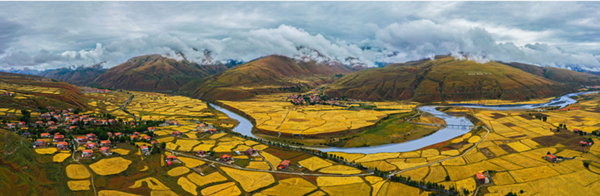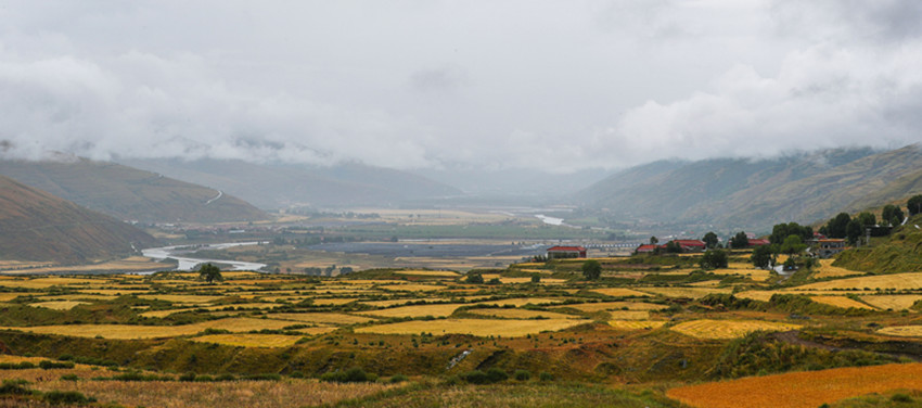 從立秋開始,陽氣漸收,萬物內(nèi)斂。在希望的田野上,主色調(diào)也從象征繁茂、成長的翠綠向代表成熟收獲的金黃漸變。爐霍縣蝦拉沱鎮(zhèn),藏房零星地點(diǎn)綴在田野間,成熟的農(nóng)作物漸染了整個秋季,讓這個小村莊如同一幅色彩斑斕的油畫。