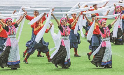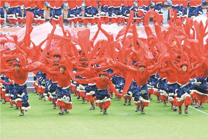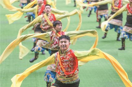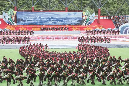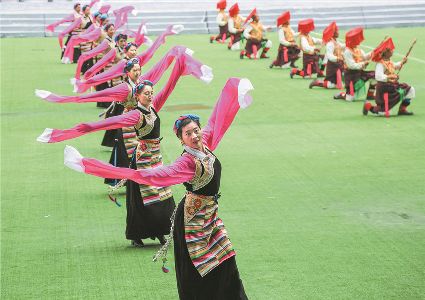 8月8日上午,康定北門體育場內(nèi)歌舞升平、彩旗飄揚,第九屆康巴藝術(shù)節(jié)開幕式文藝演出在此進行最后一次帶妝彩排。本次彩排也讓我們對開幕式文藝演出充滿了期待。