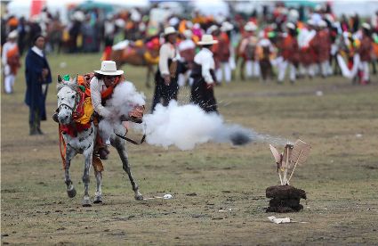 近日,在理塘縣奔戈鄉(xiāng)薩戈村八一賽馬場,來自全縣各鄉(xiāng)鎮(zhèn)近千名牧民進(jìn)行了傳統(tǒng)的馬術(shù)表演,他們以高超的騎術(shù)展演了拾哈達(dá)、馬上射擊、馬上射箭、鐙里藏身、五彩凌空等馬術(shù)技巧,把歡樂帶到草原,讓當(dāng)?shù)啬撩窈捅姸嘤慰拖硎芰艘粓鲆曈X盛宴。