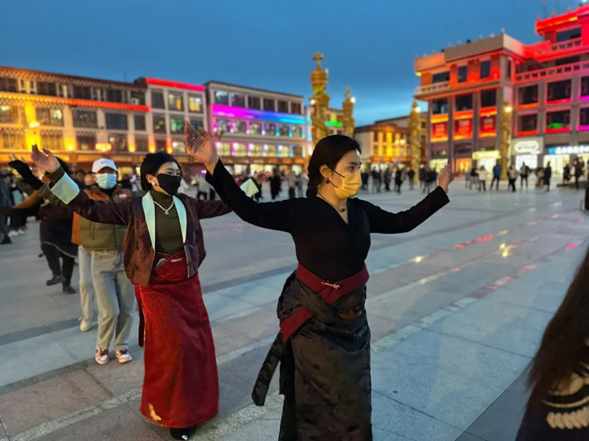 本網(wǎng)訊 每到傍晚時分,色達(dá)的金馬廣場上都會準(zhǔn)時響起起歡快的鍋莊曲。 舞者們雙手隨音樂自然張開,邁著輕快的步伐,踢腿、揚手、轉(zhuǎn)圈。游客們有的拿起手機(jī)拍照留念,有的則加入鍋莊舞的隊列。