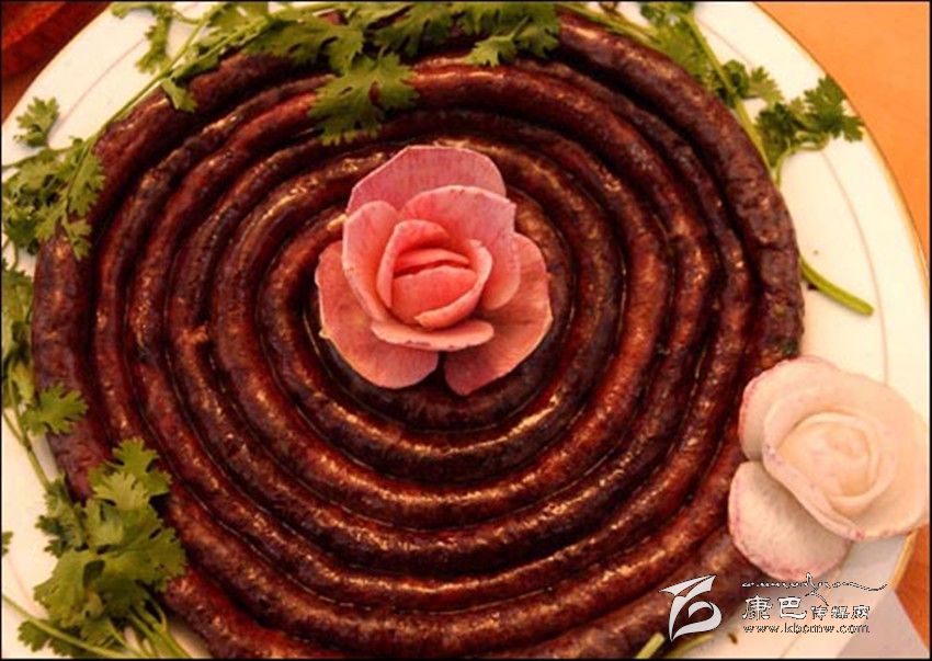 (4)血腸的烹煮,將灌好的血腸,放開(kāi)湯中煮沸,煮至血腸浮起,腸成灰白色,約八成熟時(shí)便起鍋,裝入盤(pán)內(nèi),全家席地圍坐,割而食之。