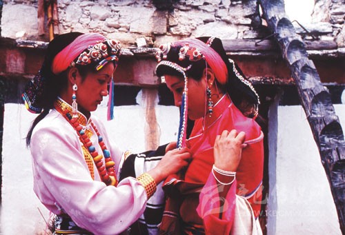康區(qū)婦女戴頭帕很有特色,嘉絨婦女繡花頭帕,以長(zhǎng)方形帕對(duì)折,戴于頭上,額前伸出約3公分,腦后下垂至后枕,寬至兩鬢,然后用大紅頭繩或五彩頭繩辮發(fā)盤(pán)于帕上,辮子套各式辮飾。康南婦女戴頭帕?xí)r,額前折褐成帽狀,腦后成巾狀下垂至肩。木雅婦女戴袋狀帽,將帽沿一側(cè)內(nèi)疊扣于買(mǎi)上,上沿額伸出頭額前約3公分,寬至兩鬢,長(zhǎng)約30公分的袋狀帽箭垂于腦后,然后用大紅頭繩或五彩頭繩編發(fā)辮纏盤(pán)于帽上。魚(yú)通人則用長(zhǎng)丈余之青綾布纏裹頭部,形成碩大的盤(pán)頭。